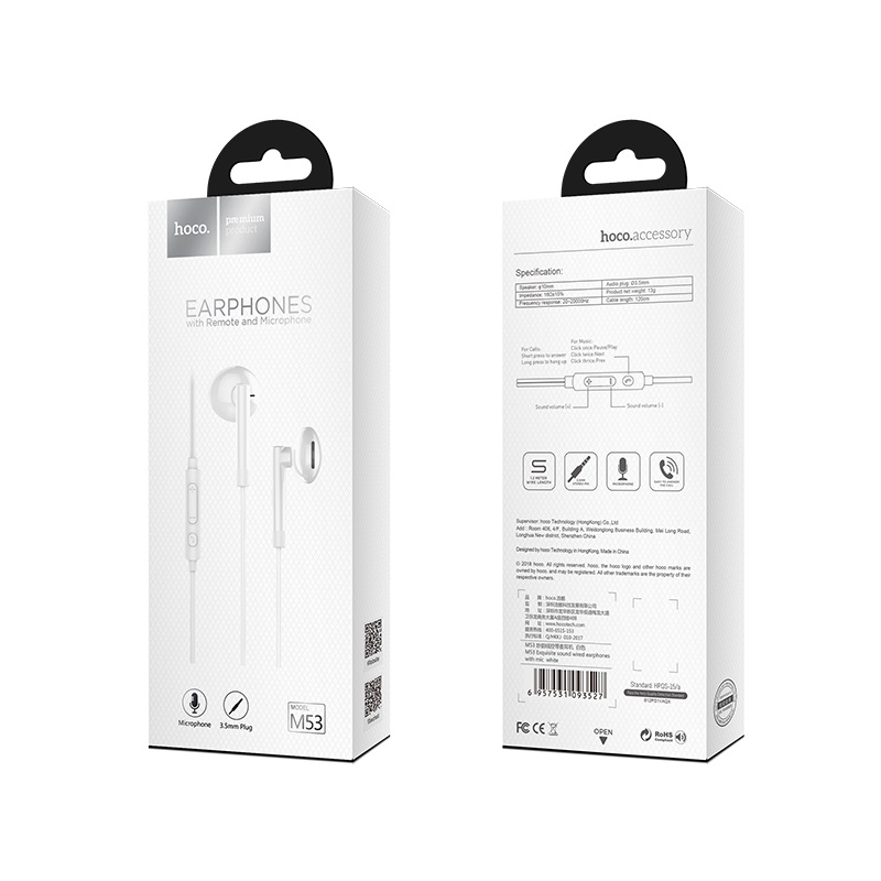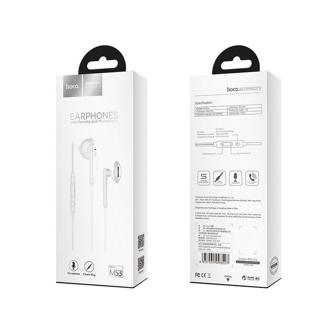 Наушники HOCO M53 Exquisite sound wired earphones with mic white