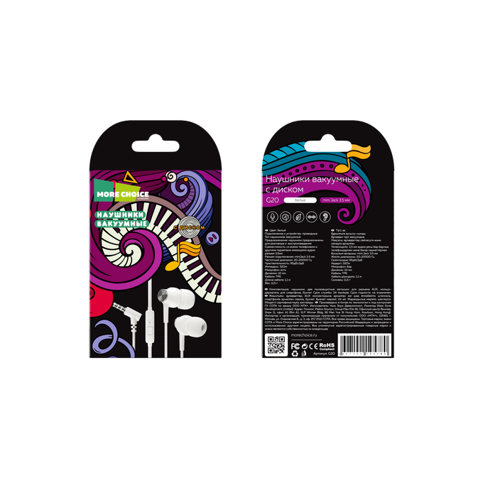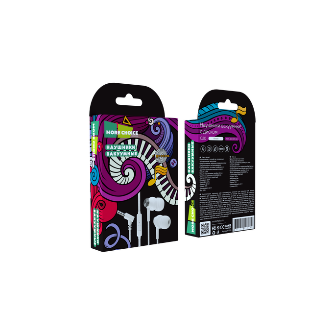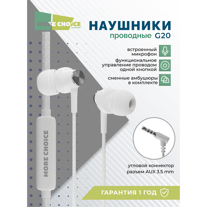 Наушники вакуумные AUX разъём с МК без рег.громкости длина 1.1м More Choice G20 (White)