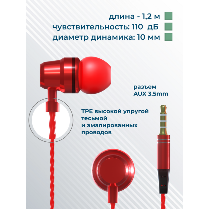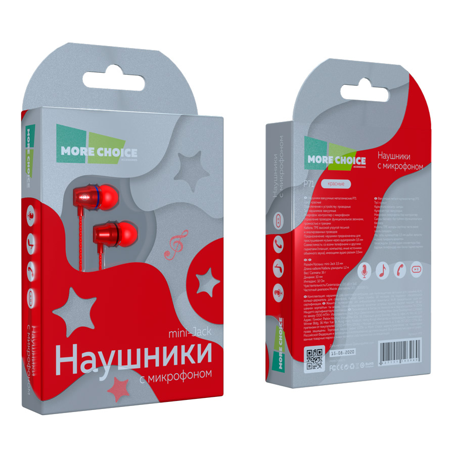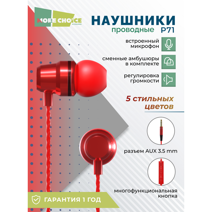 Наушники вакуумные AUX разъём с МК и рег.громкости длина 1.2м More Choice P71 (Red)