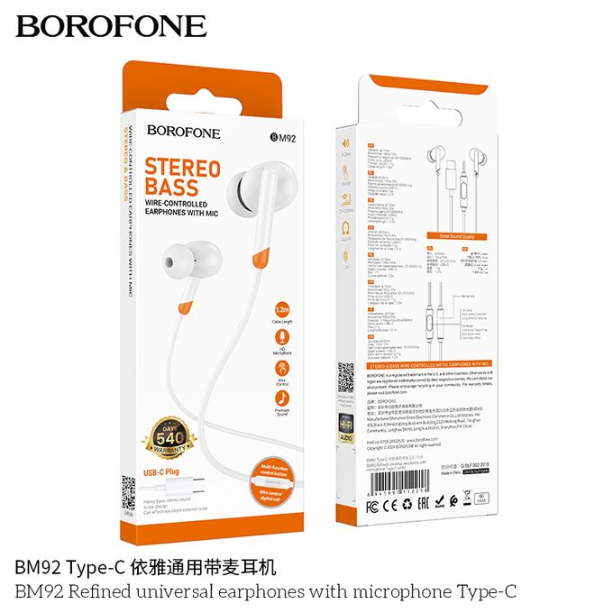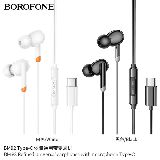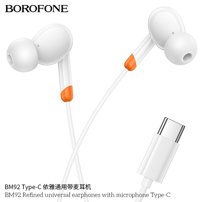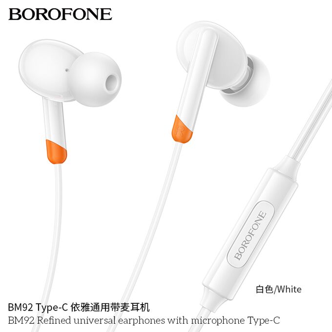 Наушники внутриканальные Borofone BM92 Refined, пластик, микрофон, кабель Type-C, 1.2м, цвет: белый (1/76/304)