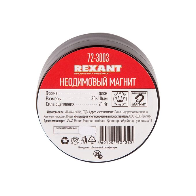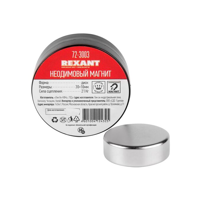 Неодимовый магнит диск Rexant 72-3003 30х10мм сцепление 21кг