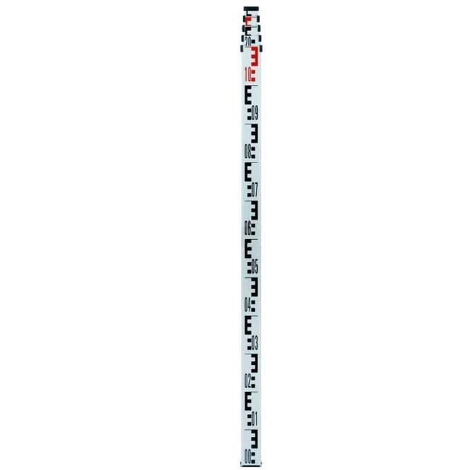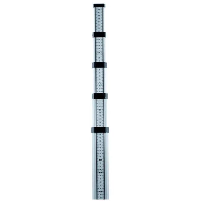 Нивелирная телескопическая рейка ADA STAFF 5 изготовлена из алюминиевого сплава. Профиль оснащен ребрами жесткости, что придает данной рейке дополнительную прочность. Кнопка для фиксации секций рейки металлизированная, стойкая к морозу и служит долгое время. Данная телескопическая рейка на оборотной стороне имеет пять секций, на каждой из которых нанесена миллиметровая шкала снизу до верху. На лицевой стороне расположена шкала «Е», которая обозначена черно/красным цветом. Есть возможность устанавливать дополнительный пузырьковый уровень на пластиковую окантовку в верхний части секции (с креплением типа «уголок») или на профиль рейки (защелкивающийся пластиковый уровень).