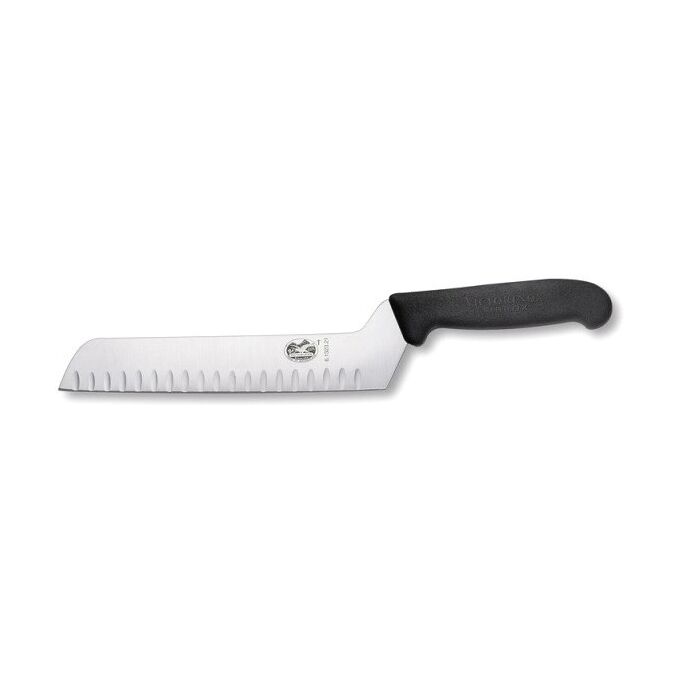 Описание: Клинок ножа имеет рифления вдоль режущей кромки, что позволяет делать нарезку толщиной с бумагу и предотвращает прилипание продукта к лезвию ножа. Маленькие воздушные карманы, образующиеся при нарезке, делают отделение продукта от ножа легким и не требующим применения пальцев.