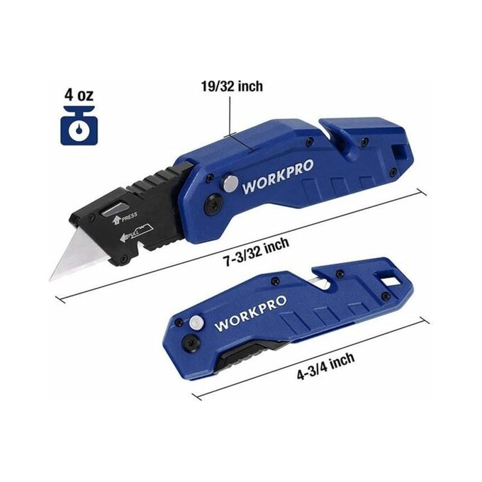 Складной быстросменный нож WORKPRO с нейлоновой рукояткой, 10 лезвий, трапециевидные лезвия WP211008 используется для резки ковра, бумаги, пластика, кожи, картона, алюминиевого листа и др. Специальный механизм обеспечивает быструю смену лезвий. Острое закаленное лезвие выполнено из стали SK5, обладающей высокой прочностью и долговечностью. Зажим для ремня служит для удобной носки ножа на ремне брюк. Нейлоновая рукоятка обладает стойкостью к износу, легким весом и эргономичной формой.