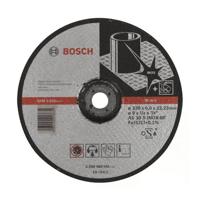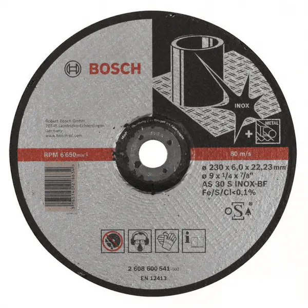 Обдирочный круг Bosch Inox 230*6 мм (вогнутый) 2608600541 предназначен для шлифовки поверхностей из нержавеющей стали. Подходит для ручных угловых шлифовальных машин