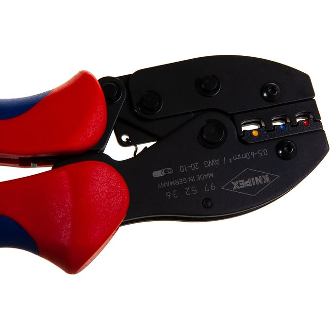 Ручной обжимник KNIPEX KN-975236 - качественный инструмент для опрессовки штекеров и кабельных наконечников. Имеет долгий срок службы, так как изготовлен из хромованадиевой электростали и прошёл закалку в масле. Инструмент оснащен пружиной для быстрого раскрытия. Для него характерно высокая передача усилия за счет передаточного отношения рычагов.