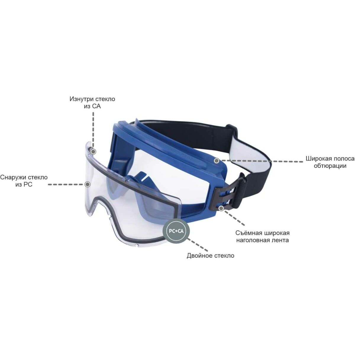 Эластичная регулируемая наголовная лента надежно фиксирует очки на голове.
