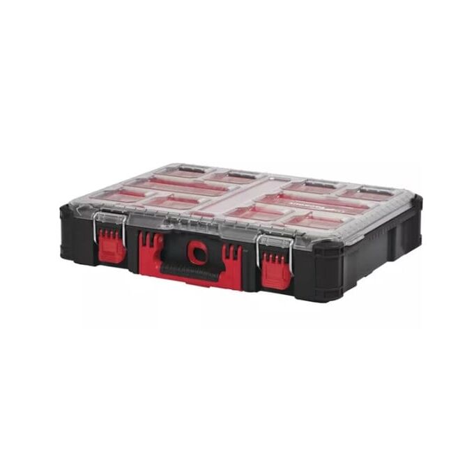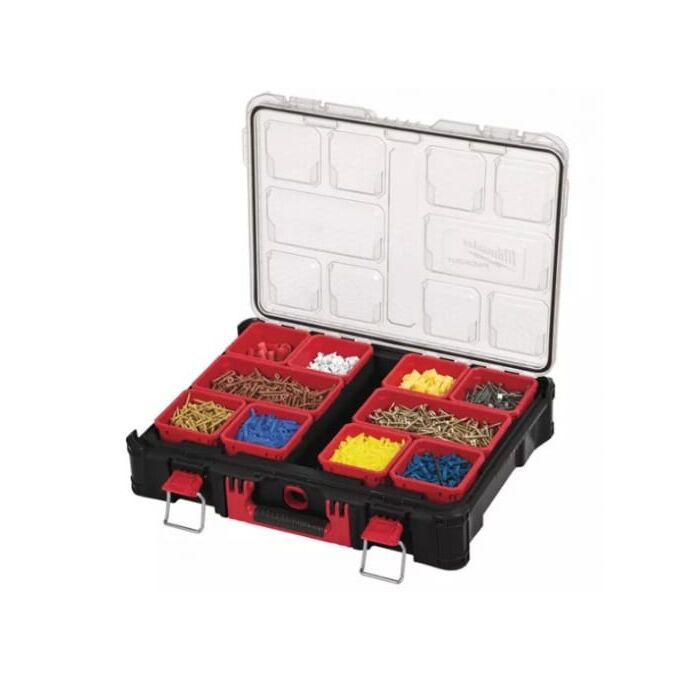 Органайзер Milwaukee PACKOUT 4932464082 оснащается 10 емкостями для хранения мелочей. Плотные перегородки емкостей герметично закрываются общей крышкой, что исключает их перемещение.