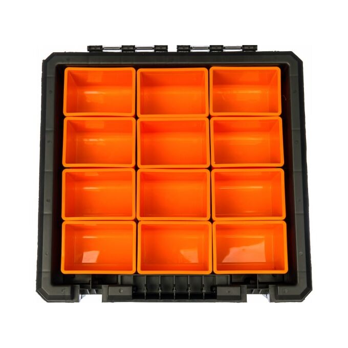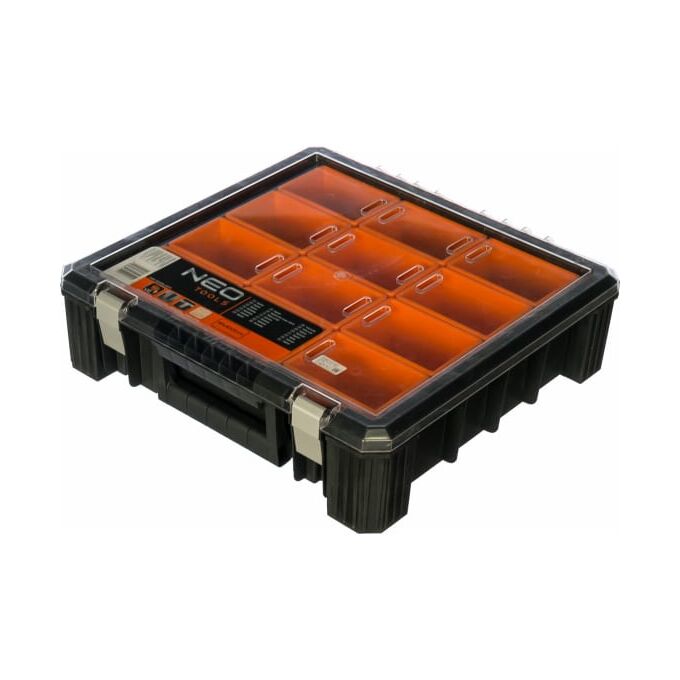 Органайзер с отделениями, 40x40x12см NEO 84-130 - универсальное приспособление для мастерской или гаража. Модель изготовлена из пластмассы и металла и оснащается противоударными уголками, что обеспечивает надежность во время транспортировки. Алюминиевые замки препятствуют случайному выпаданию крепежа во время транспортировки. Крышка органайзера выполнена из поликарбоната.