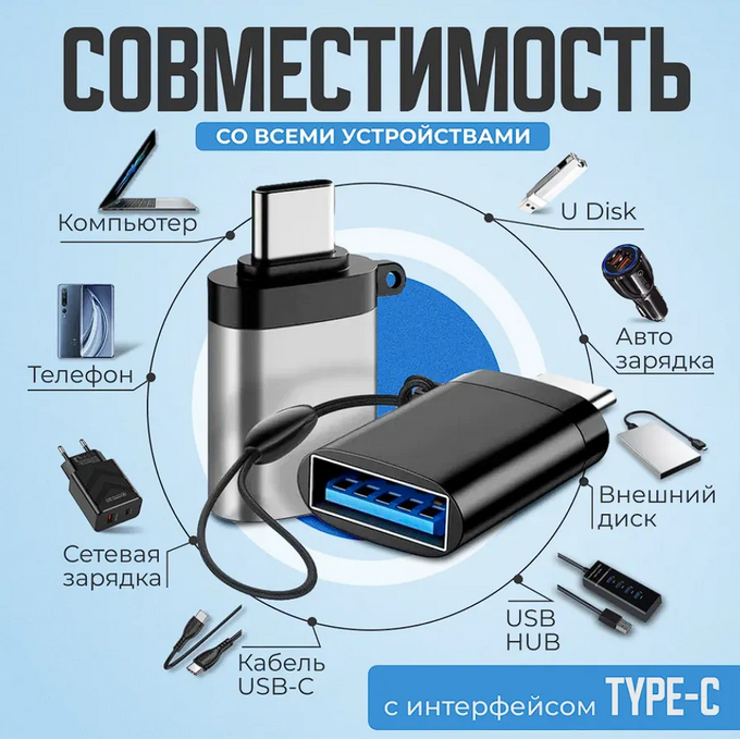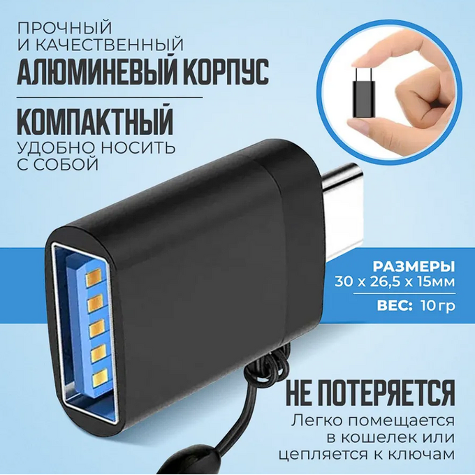 Адаптер OTG оснащен с одной стороны штекером Type C (Папа/Выход) c другой стороны разъемом USB 3.0 (Мама/Вход). Это позволяет подключать различные USB-A периферийные устройства, такие как флеш-накопители, клавиатуры и мыши, к вашим устройствам с поддержкой USB-C.
