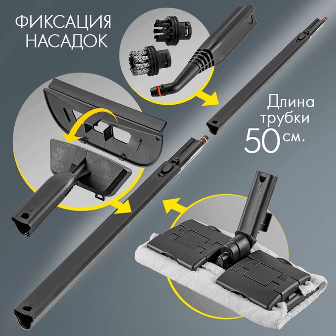 Пароочиститель, Гибкий удлинительный шланг, Насадка для пола, Удлинительные трубки, Круглая щетка с полимерной щетиной, Круглая щетка с металлической щетиной, Большая насадка-распылитель, Мерный стаканчик, Тканевый чехол для ткани, Тканевая накладка для пола, Насадка-скребок для мытья стекол / зеркал, Насадка для отпаривания, Катушка для шнура, Насадка для ковра, Чехол для аксессуаров, Руководство по эксплуатации, Гарантийный талон