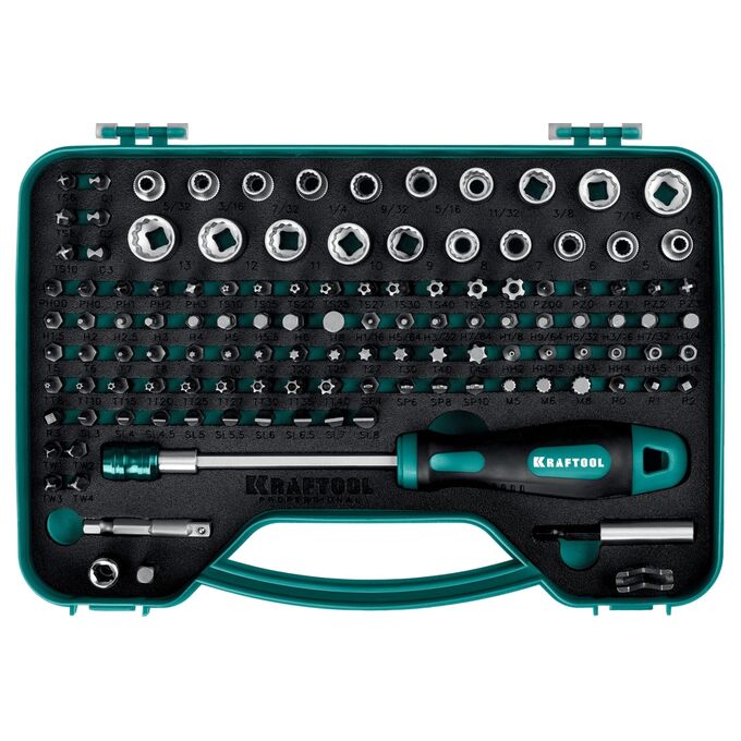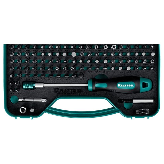 Универсальный набор бит и головок KRAFTOOL для профессионального применения в комплекте с ручным и электроинструментом. Максимальная комплектация бит и головок для любого вида крепежа.