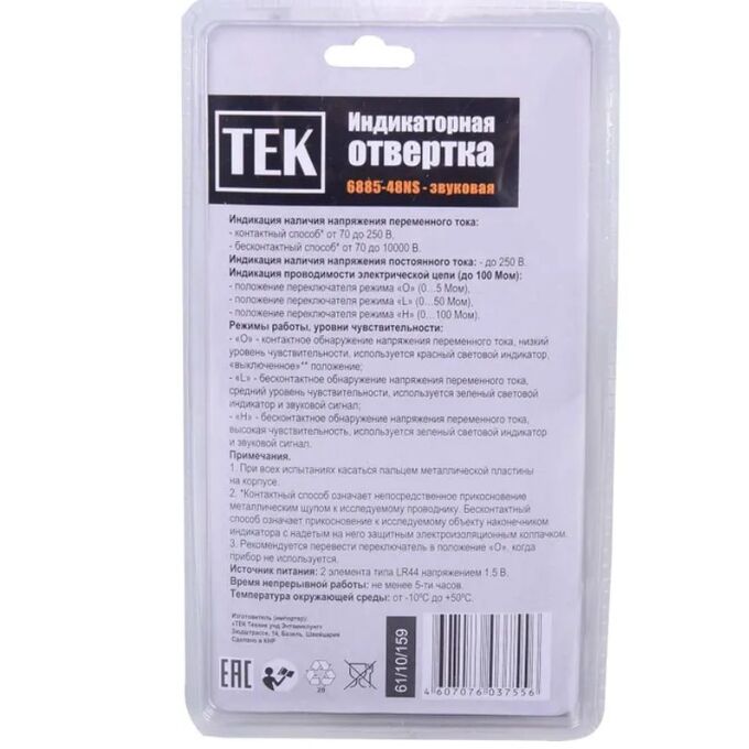 Отвертка-индикатор Ресанта 6885-48NS RFA101-звуковая 61/10/159 применяется для безопасного определения электрического тока в электросетях с напряжением до 220В. Особенностью данной отвертки-индикатора является высокий порог срабатывания по напряжению, поэтому тестер не подходит для работы с низковольтными сетями. Технические характеристики отвертки-индикатора Ресанта 61/10/159 Переменное напряжение, контактный метод, В 70-250 Переменное напряжение, бесконтактный метод, В 70-10000 Способ измерения контактный, бесконтактный Типоразмер AAA/мизинчиковая(R03;LR03;FR03) Количество батареек, шт 2
