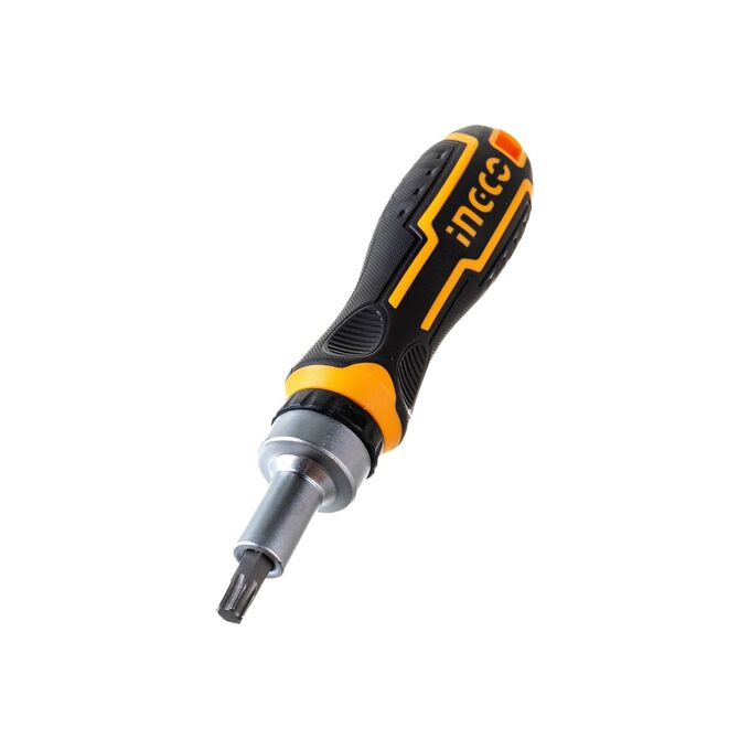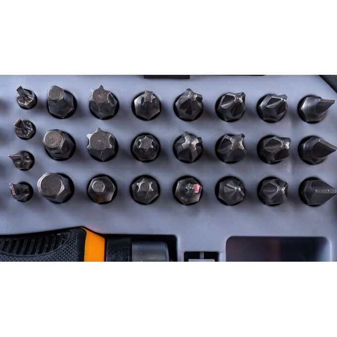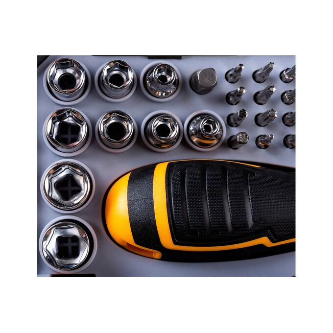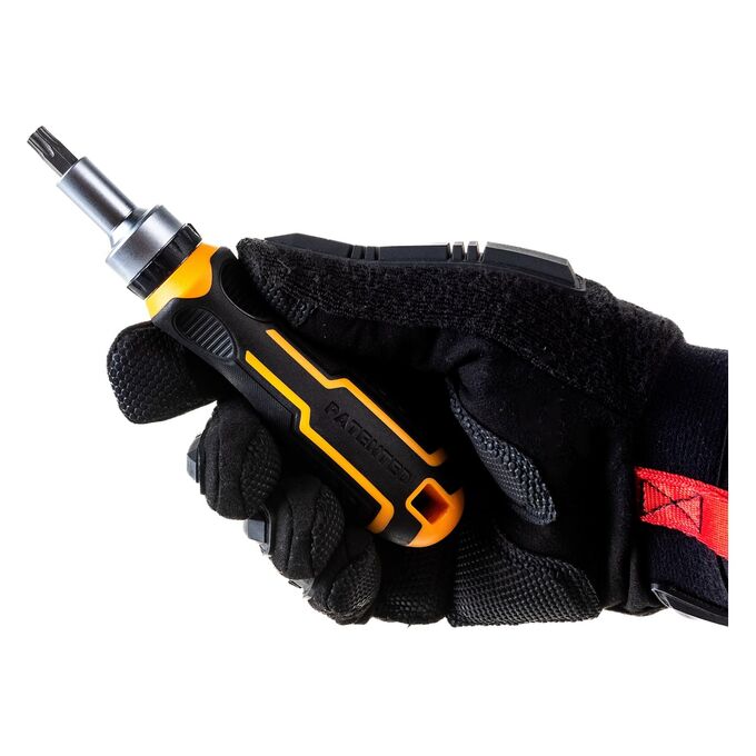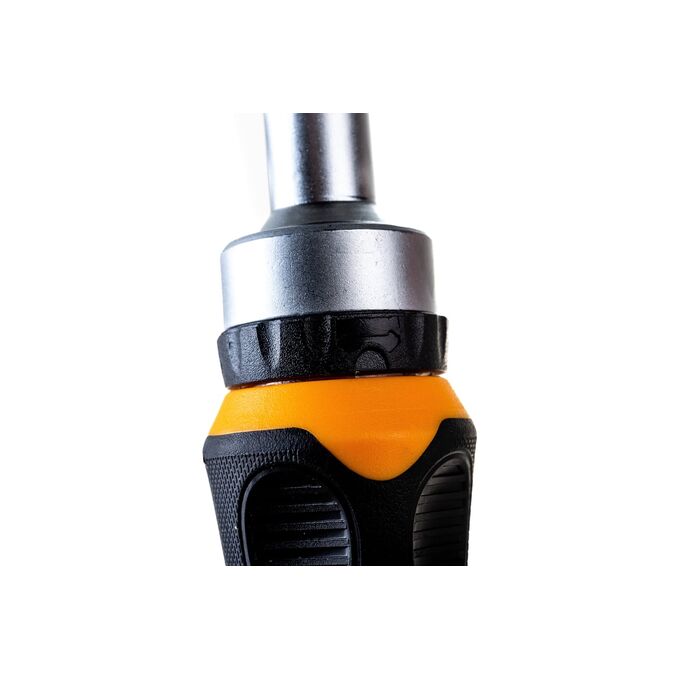 Эргономичная двухкомпонентная противоскользящая рукоятка с упором по палец. Это обеспечивает надежный захват при работе и предотвращает выскальзывание инструмента из руки. Биты выполнены из высококачественной хромованадиевой стали Cr-V. Для наиболее эффективной работы инструмент оснащен специальным трещоточным механизмом с 22 зубьями и реверсивным механизмом для удобства выполнения работ.