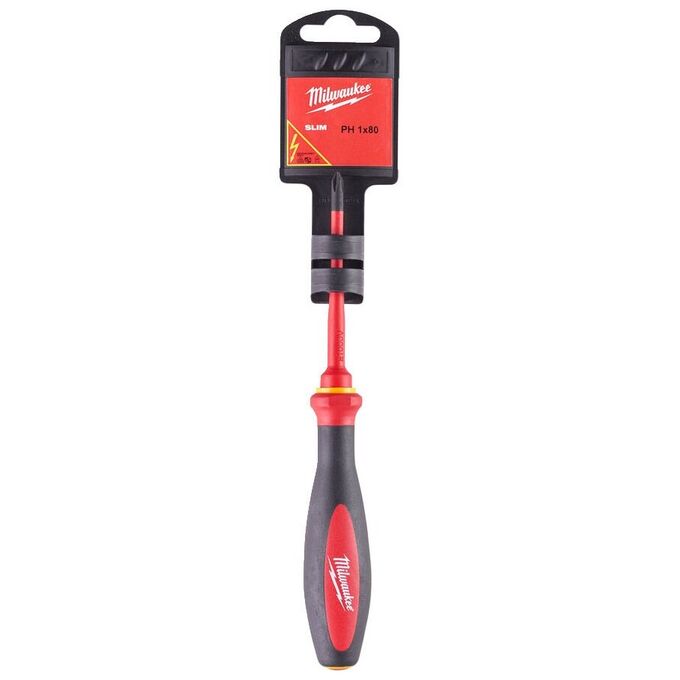 Изолированная тонкая отвертка Milwaukee VDE PH1 x80 4932471448 позволяет работать с небольшим крепежом в ограниченном пространстве.