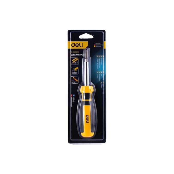 Многофункциональная отвертка DELI 6-в-1 dl260206 104516 используется для работ с резьбовыми соединениями в процессе ремонта или монтажа. Модель имеет две двусторонних насадки с двумя типами шлица. Стержни выполнены из качественной хромованадиевой стали, что обеспечивает высокую антикоррозийную стойкость и долговечность. Эргономичная рукоятка выполнена с учетом анатомических особенностей ладони, не скользит в руках и гарантирует продолжительную комфортную работу.