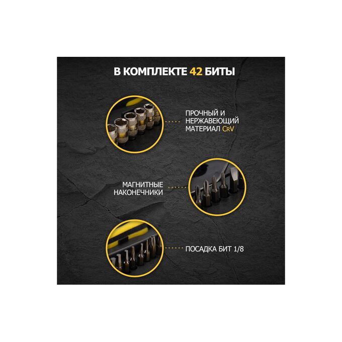 4.Биты 42 шт - Т3, Т4, Т5, Т6, Т7, Т8, Т9, Т10, Т15, Т20, H 0.9, H 1.3, H 1.5, H 2.0, H 2.5, H 3.0, H 4.0, Pentalobe 0,8, SL1.0, SL1.5, SL 2.0, SL 2.5, SL3.0, SL3.5, SL4.0, PHOOO, PHOO, PH0, PH1, PH2, треугольный шлиц 3.0, U2.6, круглой шлиц 1.5, Υ 0, Υ 1, Υ 0,8, М2.5, М3, М3.5, М4, М5, М5.5;