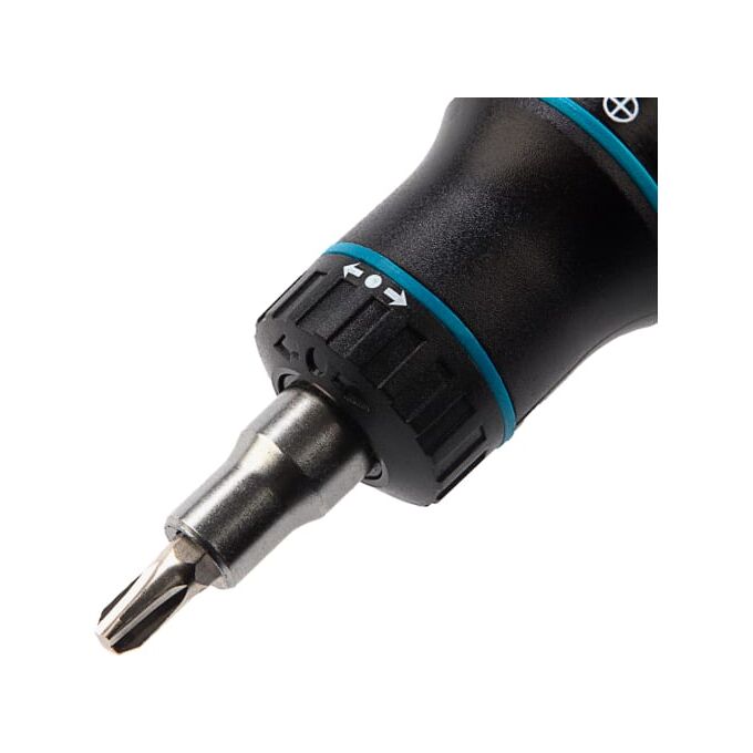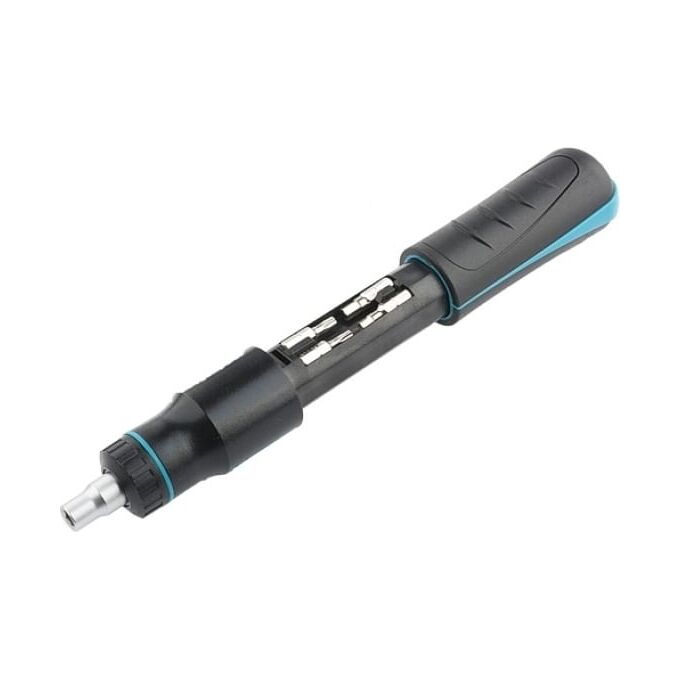 Реверсивная отвертка с револьверным механизмом поставляется с девятью сменными битами, имеющими разную форму шлица. Применяется во время сборки мебели и ремонта автомобиля. Имеет храповый механизм для смены направления вращения и механизм автоматической подачи бит в держатель. Насадки изготовлены из стали S2 и отличаются большим рабочим ресурсом.