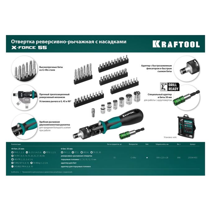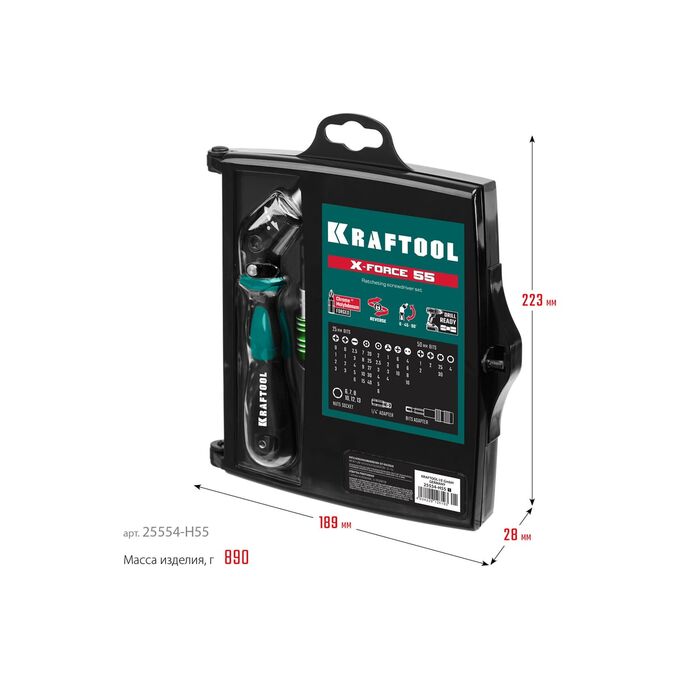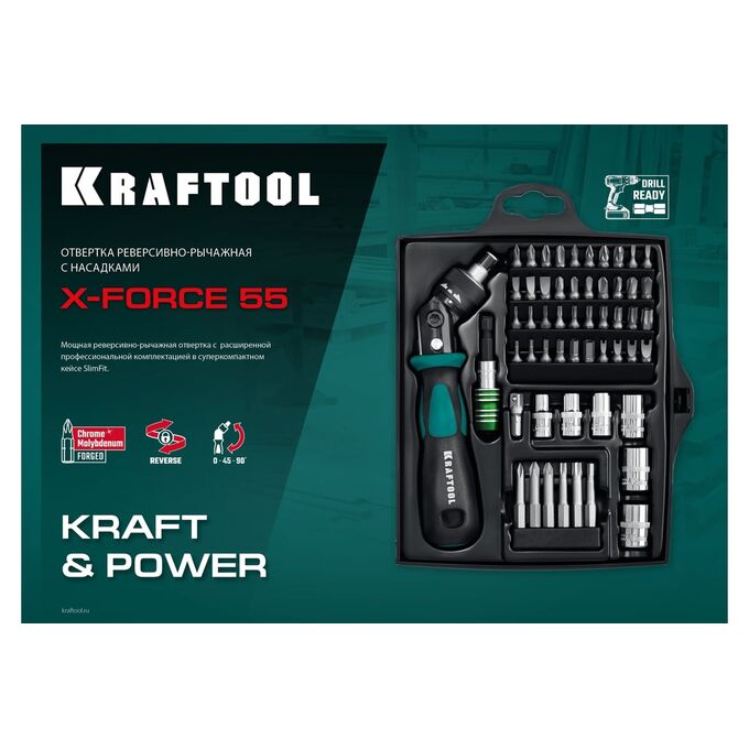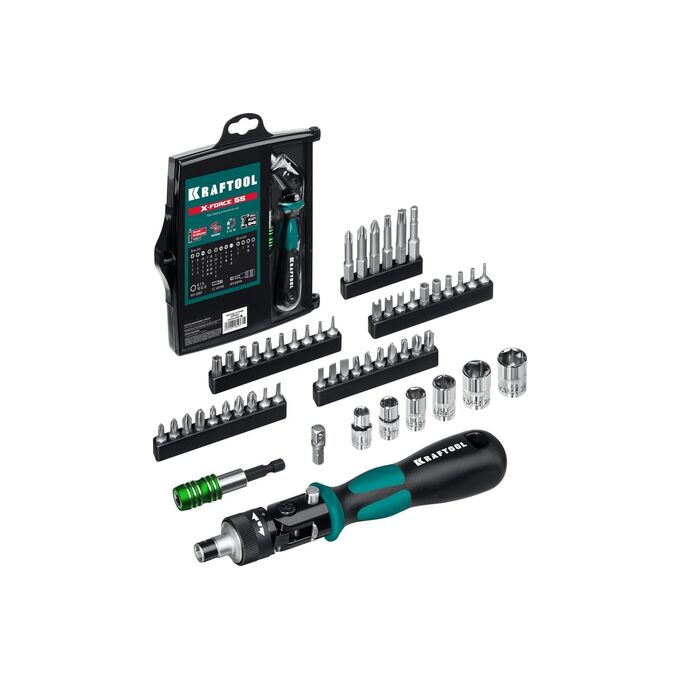 Отвертка реверсивно-рычажная KRAFTOOL X-Force-55 (25554-H55-z01) с насадками 55 шт
