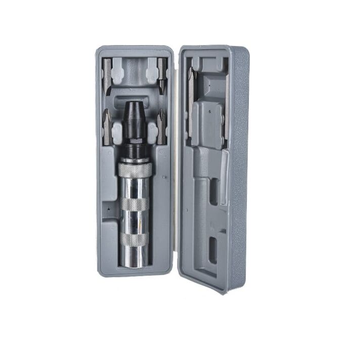 Ударно-поворотная отвертка с присоединительным шестигранником 1/2"", с набором из 6 бит, в пластиковом боксе, используется для закручивания и откручивания крепежей, в том числе для демонтажа перетянутых или застарелых резьбовых соединений.