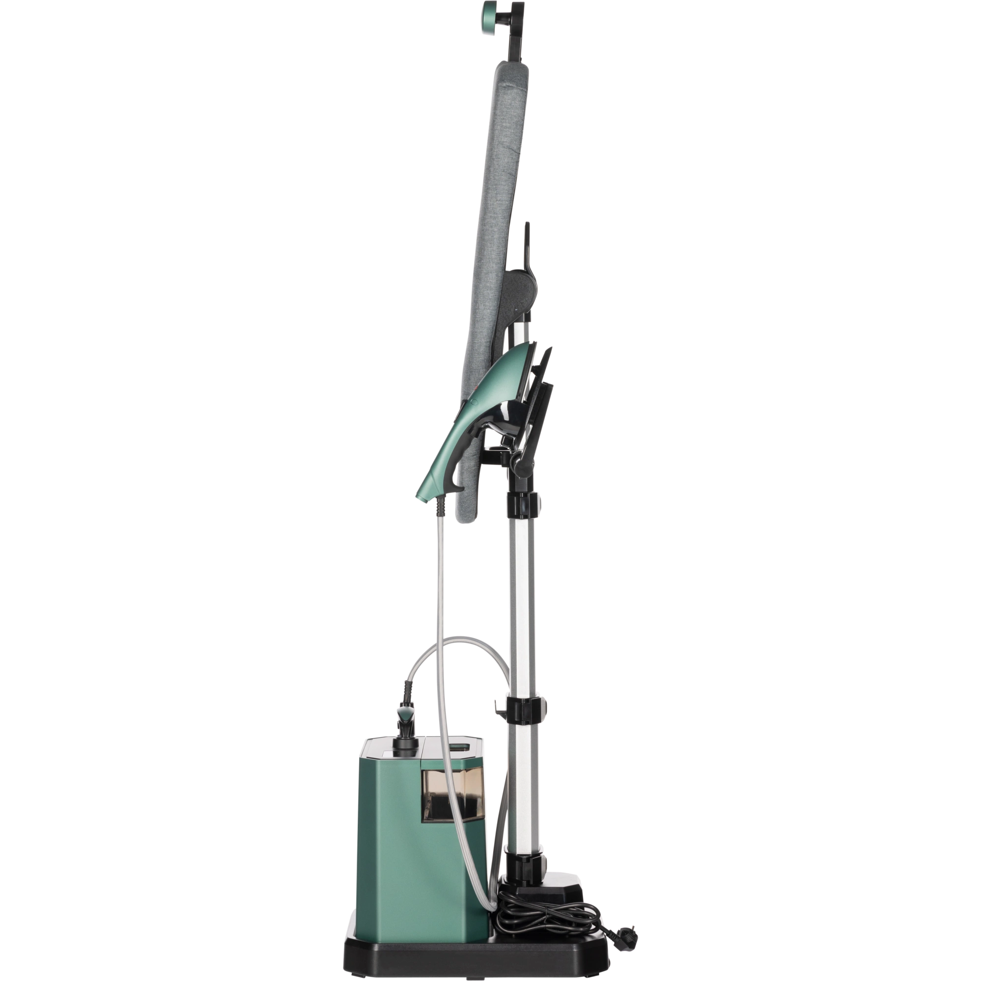 Рабочая поверхность доски с мягким тканевым чехлом способна принимать четыре положения: горизонтальное, вертикальное, под углом 30 и 60 градусов. Это позволяет адаптировать паровую гладильную систему под разные типы одежды и сценарии использования — от классической глажки рубашек, платьев на плечиках до вертикального отпаривания костюмов. Со съемным мобильным блоком на колесиках и шлангом длиною 1,45 м легко отпаривать шторы на карнизе.