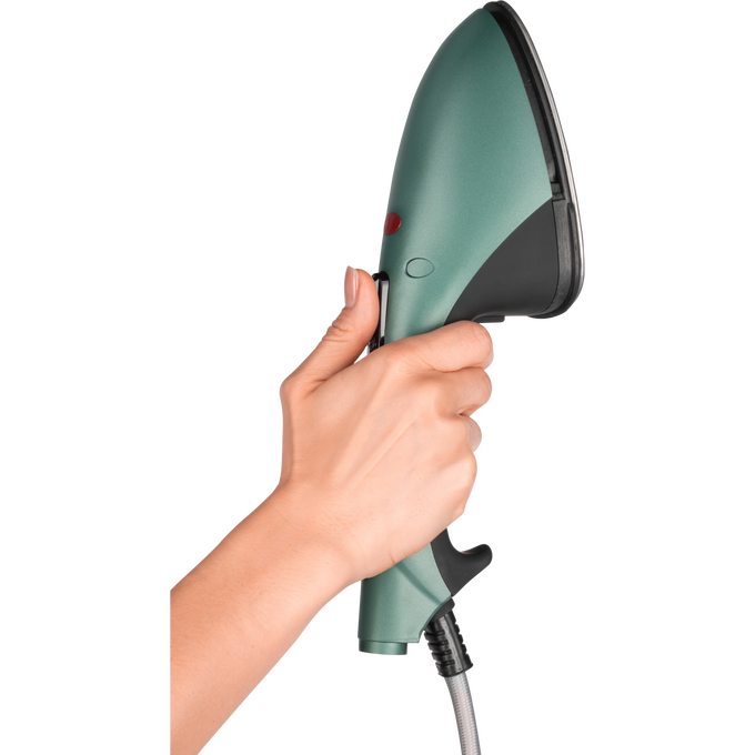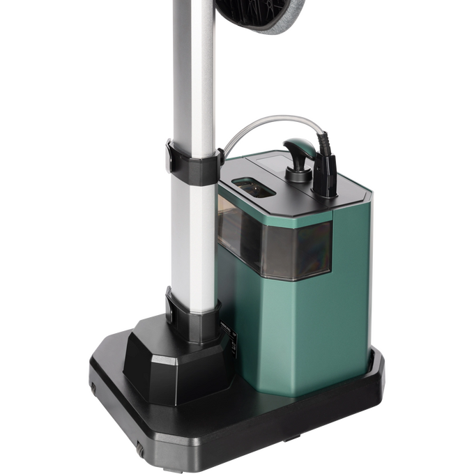 Конструкция на прочном телескопическом шесте с фиксаторами отличается устойчивостью и надежностью. Объем съемного резервуара для воды составляет 2,9 литра — это позволяет гладить до 66 минут без пополнения емкости. Такой объем идеален, если необходимо часто гладить или предстоит привести в порядок гардероб после стирки.
