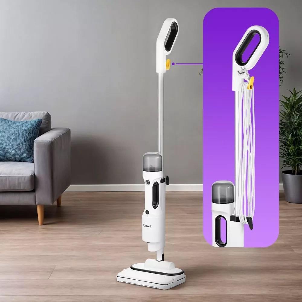 Паровая швабра «2 в 1» КТ-1062 — универсальное устройство, которое поможет избавиться от пыли и грязи с помощью мощной струи пара и продезинфицирует поверхность. Паровая швабра очистит раковину и плиту на кухне, зеркала и мебель исключительно паром.