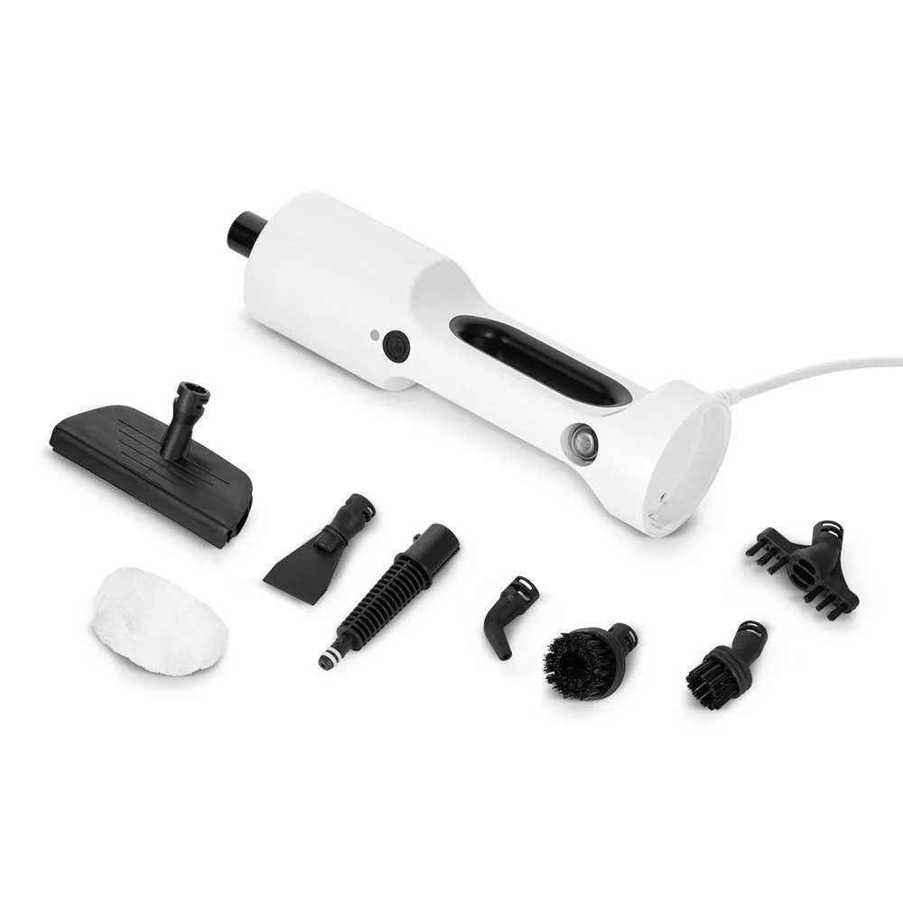 Конструкция «2 в 1» предусматривает наличие ручного модуля, который используется с насадками: плоская и круглые нейлоновые щётки, насадка для отпаривания с резиновым скребком, тряпка для отпаривания. С их помощью можно очистить любые вещи в доме.