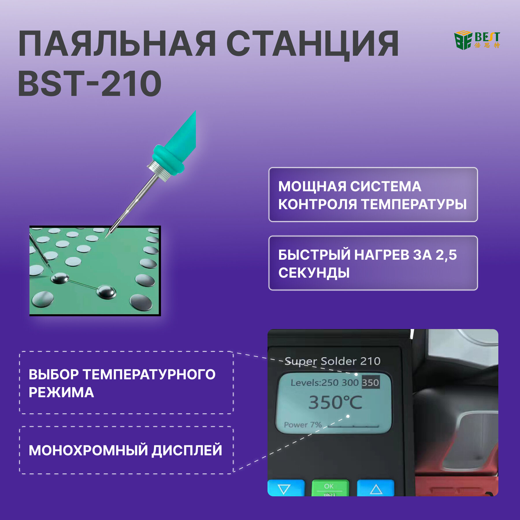 BST-210 — это высокопроизводительная интеллектуальная паяльная станция, предназначенная для различных применений, включая сварку и ремонт печатных плат BGA (с шариковой решеткой). Это универсальный инструмент, подходящий как для профессиональных, так и для любительских целей. Ключевые особенности: