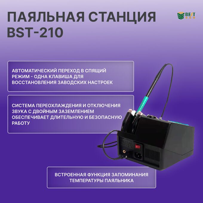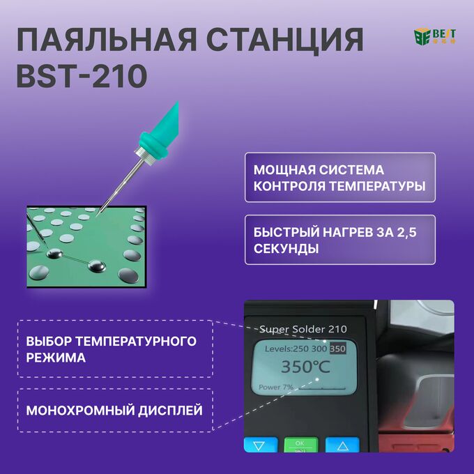 В целом, BST-210 — это надежная и универсальная паяльная станция, подходящая для широкого спектра применений: от ремонта мобильных телефонов до ремонта печатных плат и доработки SMT (технологии поверхностного монтажа).