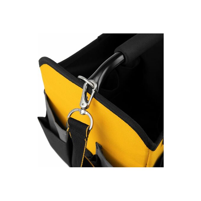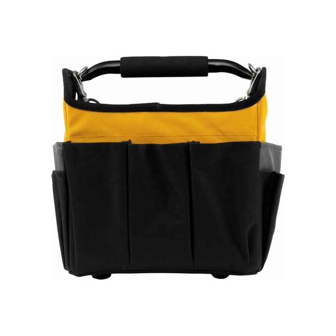 Переноска для инструмента Denzel 260x240x300 мм, 22 кармана, наплечный ремень 90294 предназначена для транспортировки и хранения ручного инструмента. Множество внешних и внутренних карманов удобны для быстрого доступа к нужному инструменту, а также позволяют оптимизировать пространство переноски. Переноска оснащена стальной рукояткой с неопреновой круглой накладкой, а также плечевым ремнем с возможностью регулировки длины (широкая подвижная накладка для удобства). Данная модель удобна, как при выездных работах, так и для хранения инструмента, например, дома, в машине, на даче или в гараже. Материал переноски - плотный полиэстер (600 D), устойчивый к истиранию. Конструкция сумки усилена боковым каркасом. На дне сумки с внешней стороны установлены пять пластиковых сферических подставок. В случае необходимости, стальные карабины на плечевом ремне позволяют быстро отсоединять его от переноски. Длина плечевого ремня 1350 мм.