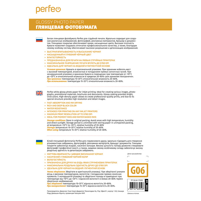 Фотобумага Perfeo А4 170 г/м2 глянцевая 50л (PF-GLA4-170/50) (G06)
