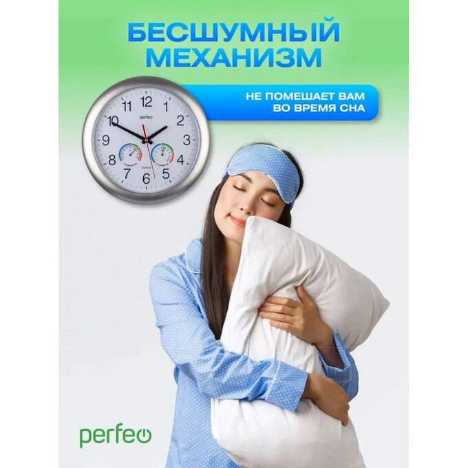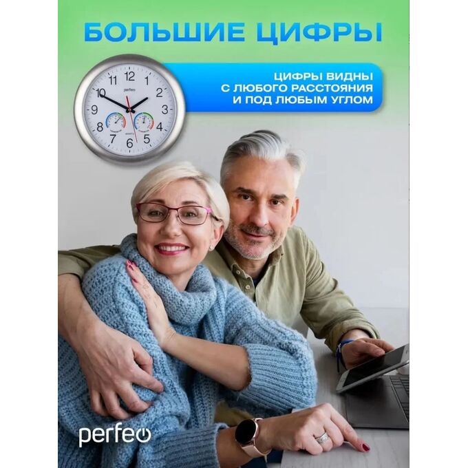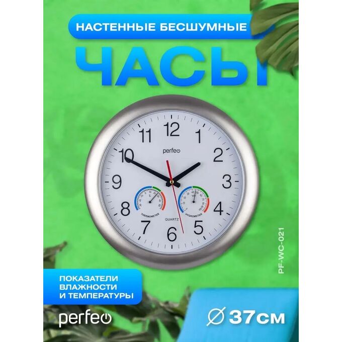 Настенные часы Perfeo "PF-WC-021", круглые д. 36 см, серебряный корпус / белый циферблат