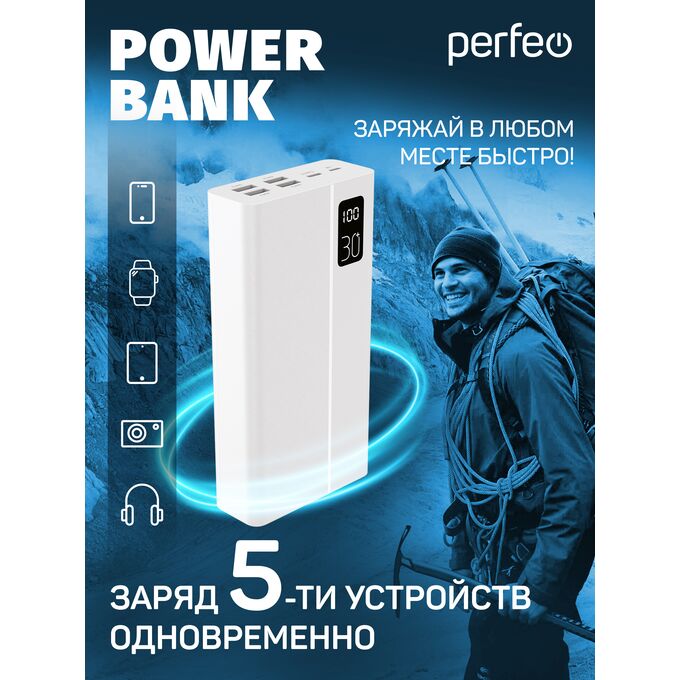 Повербанк Perfeo MOUNTAINS 30000 mAh/LED дисплей/PD + QC 3.0/Type-C/4 USB/Выход: 3A, max 22.5W/White