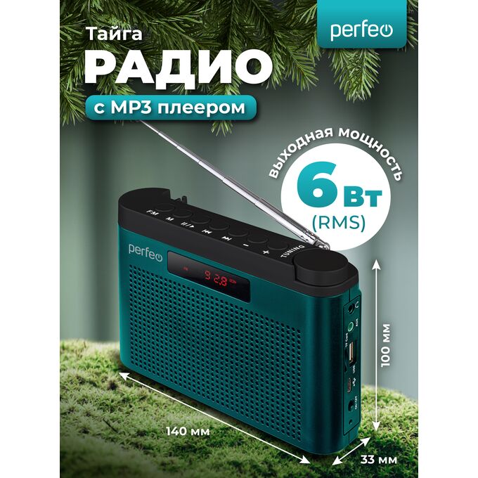 Портативный радиоприёмник УКВ/FM с разъемами USB и microSD. Perfeo "Тайга" создан на базе уже проверенного тюнера модели Perfeo SV922. Радиоприемник в классическом корпусе имеет стильный внешний вид, удобное колесико-регулятор радиоволны и кнопки управления на верхней грани устройства. Поворотная телескопическая антенна принимает сигнал в 2-х самых популярных диапазонах (УКВ и FM), также предусмотрена возможность выборочного запоминания 10 станций. Есть встроенный MP3-плеер, который воспроизводит MP3-файлы с карты памяти microSD или USB-накопителя. Аудиовход AUX, разъем для наушников и поддержка режима USB-аудио расширяют функционал приемника. За насыщенное звучание приемника и создание эффекта глубины звуковой сцены отвечают два активных 40мм динамика (RMS 6 Вт) и пассивный сабвуфер Bass Booster. Автономная работа осуществляется от встроенного аккумулятора 18650 (1800 мАч), зарядка от USB-порта (кабель mini USB - USB в комплекте). Радиоприемник от сети может работать через USB-адаптера (приобретается отдельно), варианты адаптеров приведены на фото к товару. В нашем ассортименте магазина Perfeo есть множество портативных радиоприемников, они станут отличным подарком для родителей, дедушек и бабушек, подарят хорошее настроение и станут украшением вашего интерьера, прекрасно впишутся в любой дизайн, как дома, так и на даче, незаменимы в походе. Радиоприемник легко зарядить от повербанка, он не прихотлив в использовании.