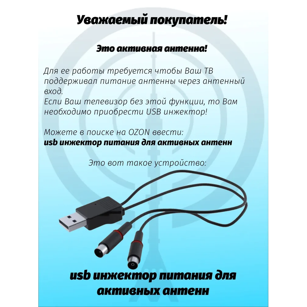 Модель имеет встроенный усилитель, предназначенный для надежного приема сигнала внутри помещения. Использование дополнительного блока питания не требуется, так как антенна питается непосредственно от цифрового телевизионного ресивера. Корпус выполнен из прочного и износостойкого пластика. Кабель, входящий в комплект, имеет длину в 1,2 м.