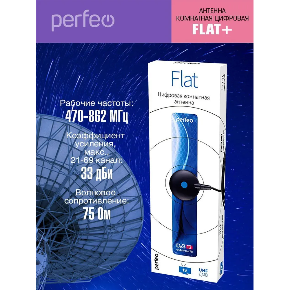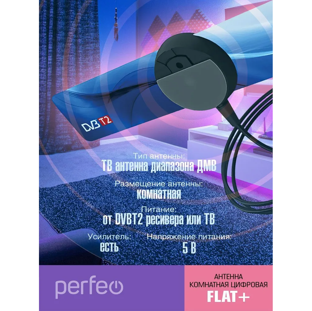 Комнатная цифровая антенна Perfeo Flat+ представляет собой простое в настройке и эксплуатации устройство, которое можно разместить на столе или установить на стене — для этого предусмотрены специальные присоски. Поддерживает частотные каналы в пределах 470-862 МГц. Способно принимать такие распространенные стандарты цифрового вещания, как DVB-T и DVB-T2.