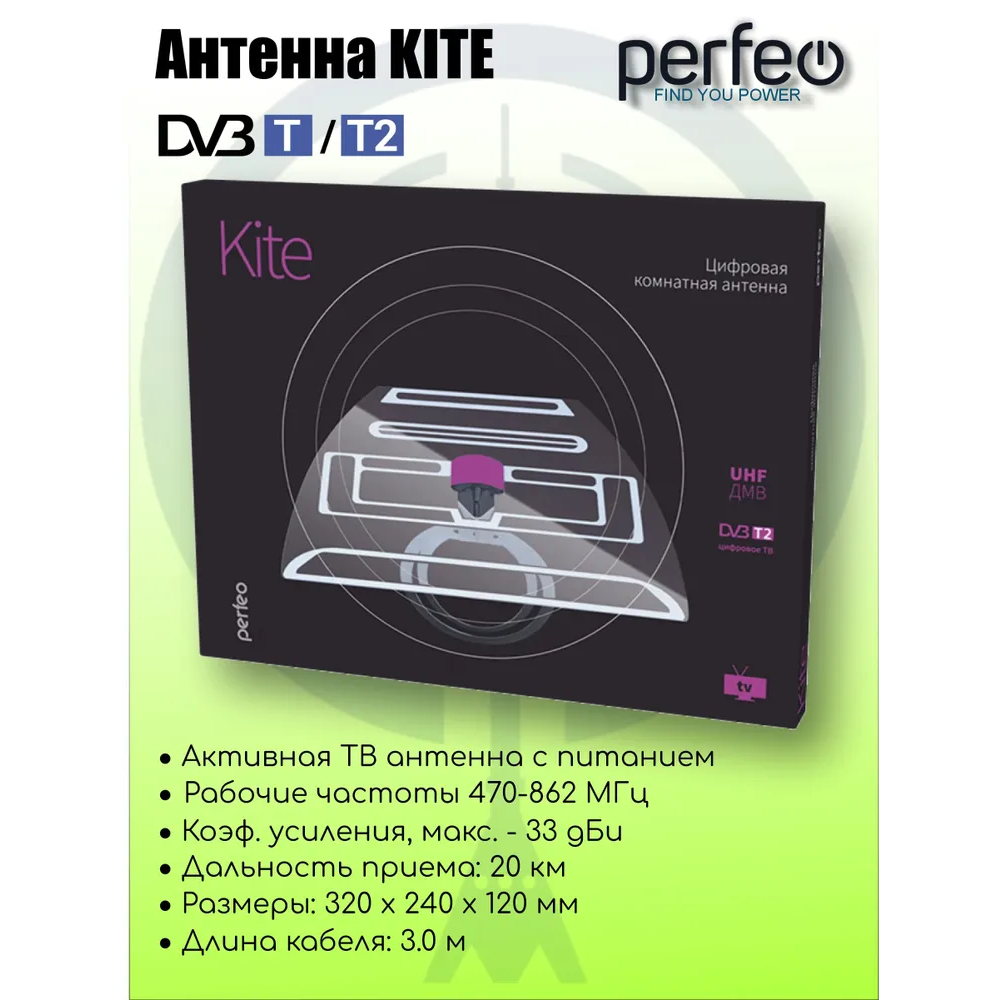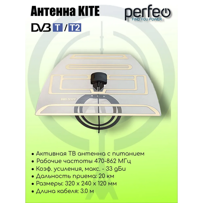Антенна ТВ Perfeo "KITE", активная, встр. усилитель, питание от ресивера 5V, DVB-T2 (BAS-5122), (Арт. PF_A4210)