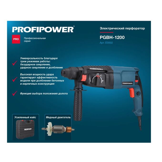 Перфоратор ProfiPower DRF-226 Мощность 1200Вт отличается мощным ударом и удобством в использовании. Модель подходит для сверления в дереве, пластмассе, металле, сверления с ударом и долбления в бетоне, штукатурке, кирпичной кладке, керамике. Наличие трех режимов работы: долбление, сверление, сверление с ударом, плюс - функция поворота долота уверенно обеспечивает выполнение работ без использования дополнительного инструмента. SDS-Plus патрон и блокировка шпинделя облегчают замену оснастки одной рукой без помощи инструмента. Система Vario-Lock обеспечивает фиксацию перфоратора в 36 угловых положениях. Среди функций также стоит выделить блокировку вращения для долбления, блокировку удара для сверления и функцию реверса. Арамидный бандаж ротора, упрочненный стальной редуктор, подшипники NSK, лабиринтная защиты от пыли повышают надежность и увеличивают срок службы инструмента. Модель подходит для крепления легких навесных конструкций, монтажа сборных перегородок, установки дверей, фиксации окон в кирпичных стенах, монтажа электролиний, пробивки штроб и решения подобных задач в домашней мастерской или на приусадебном участке.
