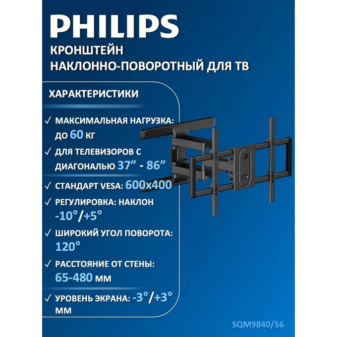 Кронштейн для ТВ 37"-86", Max 60кг, расстояние от стены 65-480мм