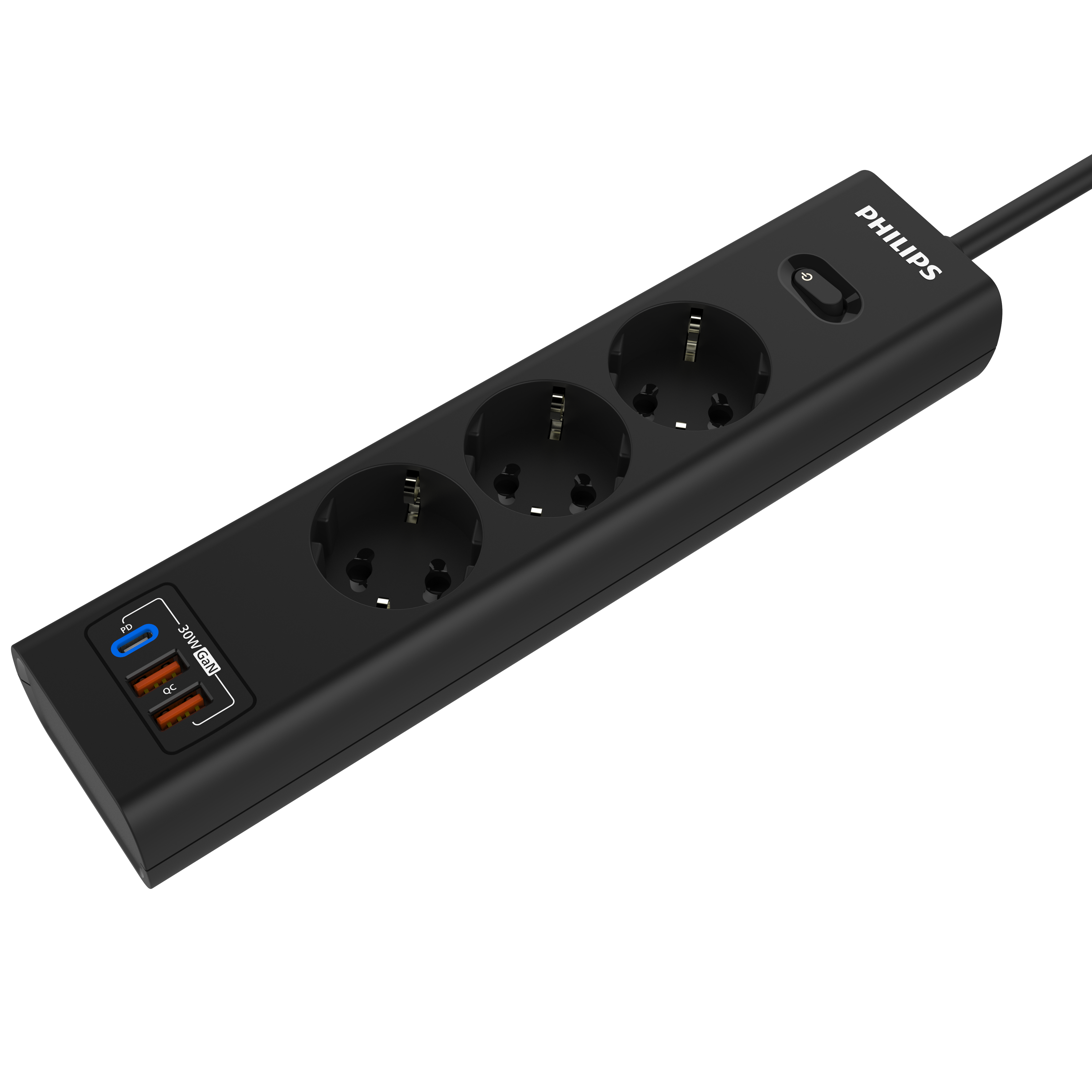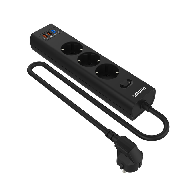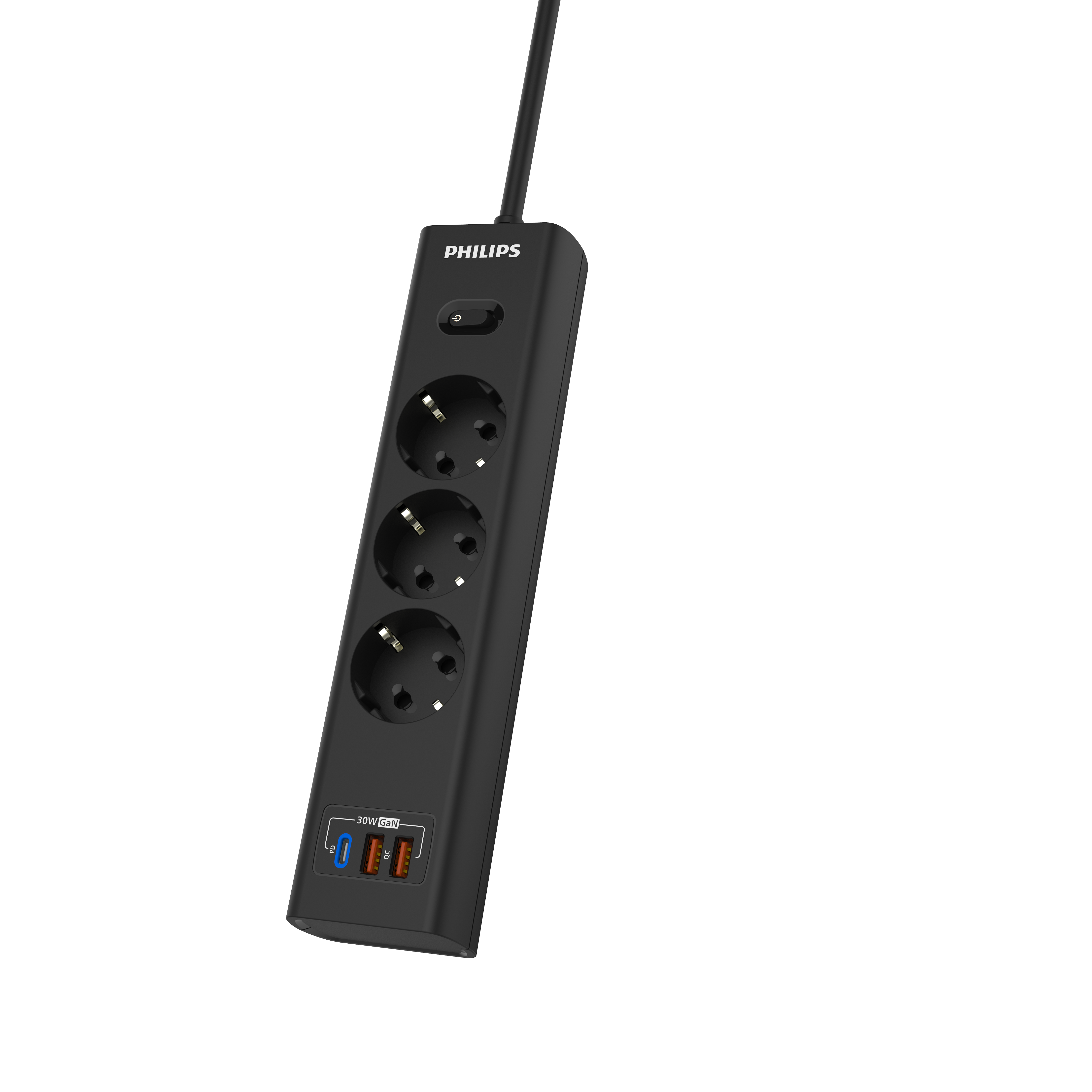 Philips сетевой фильтр 3 Розетки с USB PD/QC3.0 (5/9/12В) 30Вт кабель - 3M черный