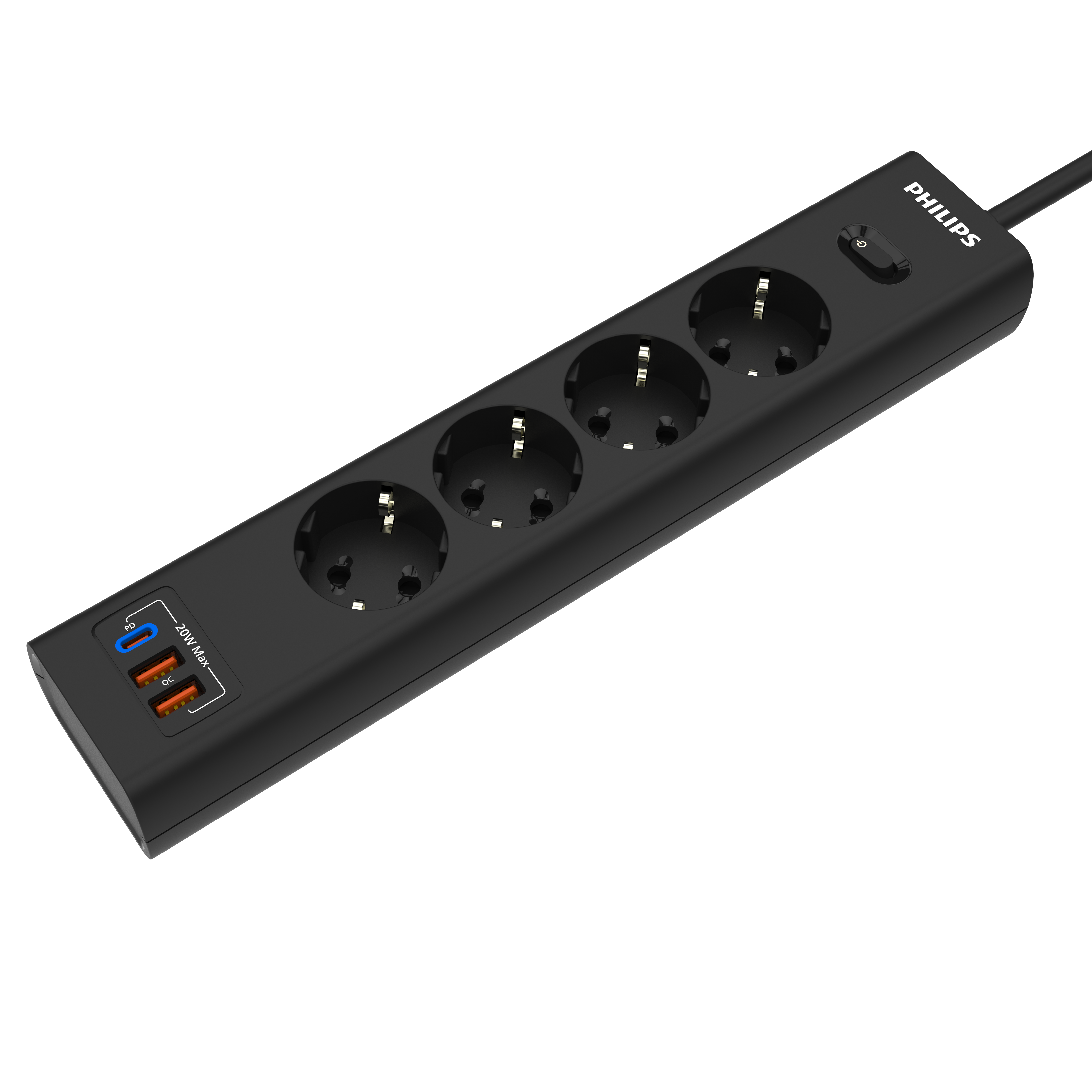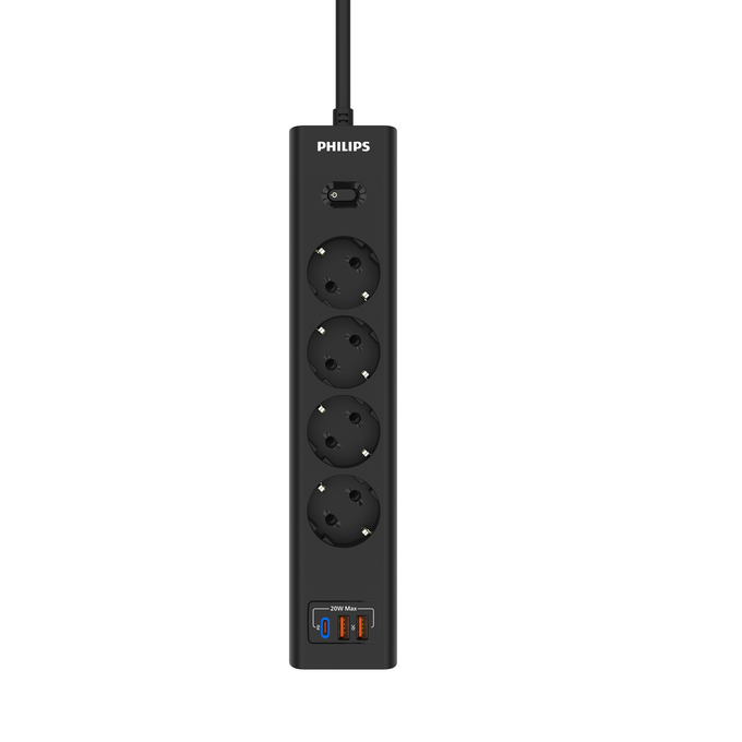 Philips сетевой фильтр 4 Розетки с USB PD/QC3.0 (5/9/12В) 20Вт кабель - 5M черный