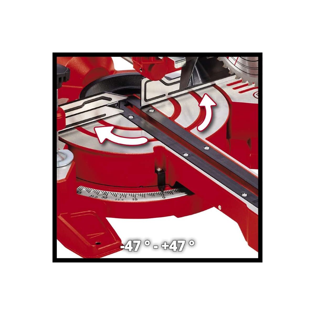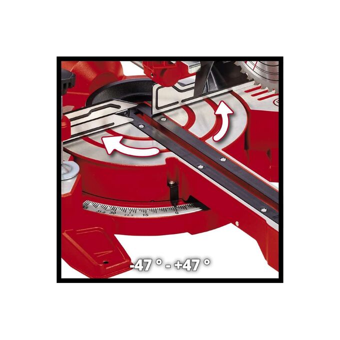 Пильная головка наклоняется влево на угол до 45°, позволяя осуществлять косой рез и снимать фаски.