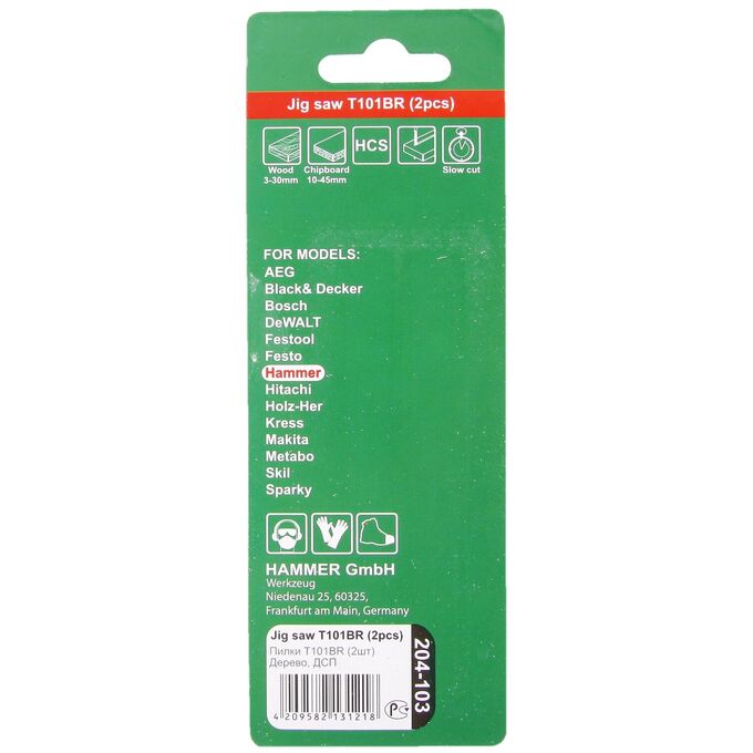Предназначены пилки Hammer 204-103 JG WD T101BR для резания таких материалов, как дерево, ДСП, ДВП, а также пластик и столярные плиты. Особенность оснастки в наличии реверсивных зубьев, что делает возможным обратный рез. Минимизацию сколов и высокоскоростной рез обеспечивают отшлифованные и хорошо заточенные зубья, которые разведены под свободными углами. Общая длина пилок составляет 100 мм, а рабочая длина соответствует 74 мм. Шаг зубьев оснастки равен 2.5 мм.