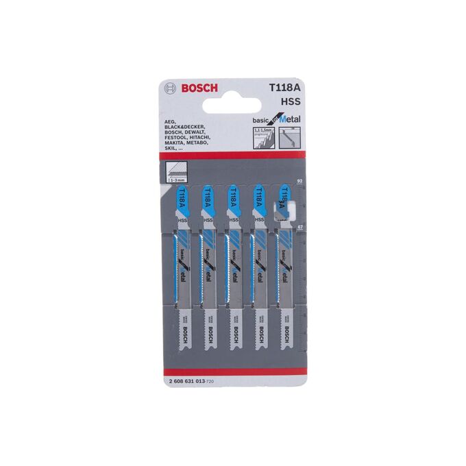 Пилки для лобзика BOSCH 2608631013 T118A по стали 67мм, чистый рез, HSS, 5шт блистер, Упаковка