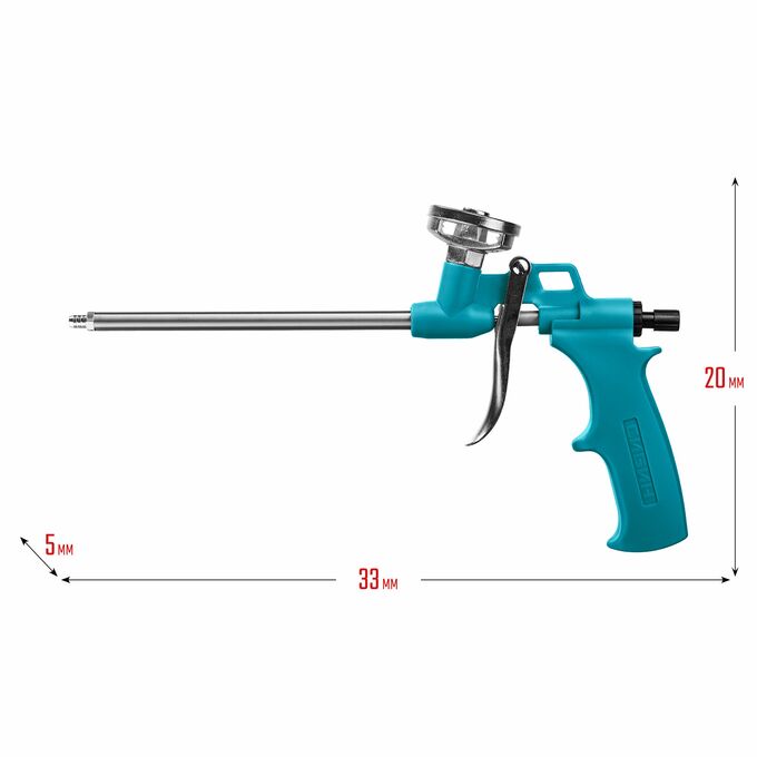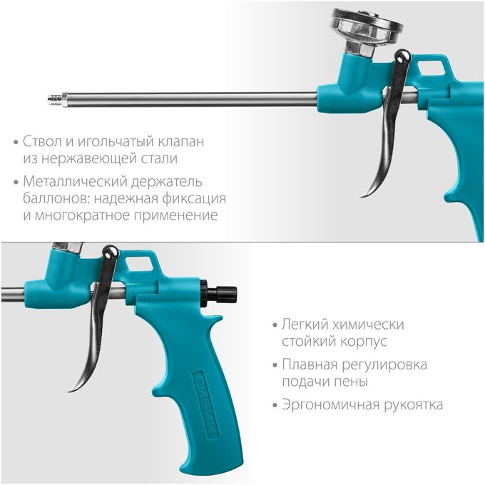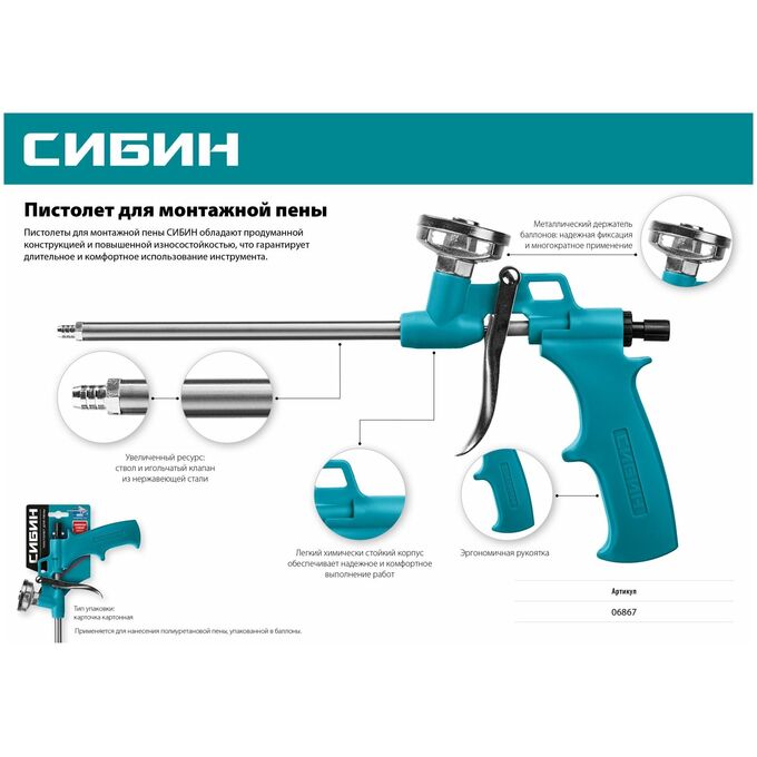 Пистолет для монтажной пены с металлическим держателем СИБИН 06867 подойдет для бытового использования.