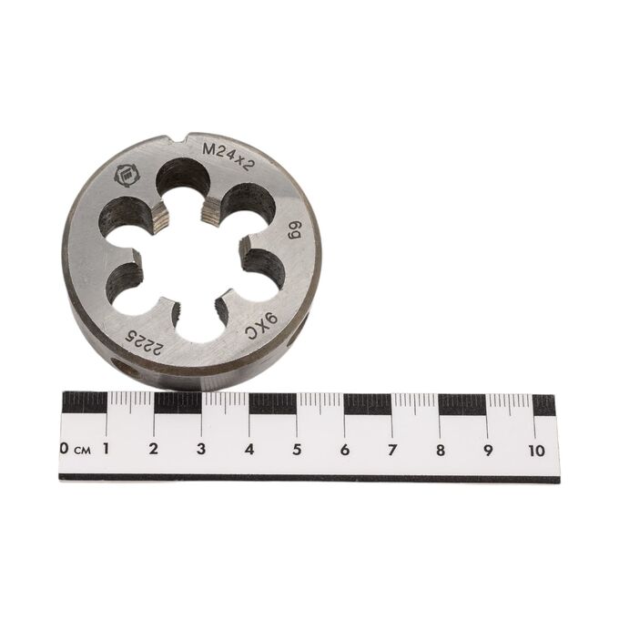 Плашка М 24 х2 9ХС ТМ Туламаш 57928 разработана для крупной резьбы. Изделие представляет собой прочный инструмент с добавлением в сталь хрома и углерода.