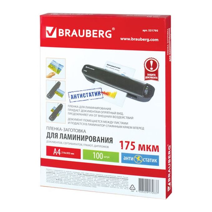 Пленки-заготовки для ламинирования BRAUBERG 531795 антистатик, А4 175мкм 100шт
