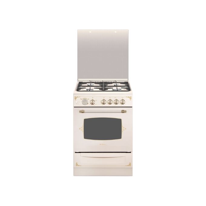 Плита Газовая Gefest ПГ 6100-03 0279 кремовый/рисунок "ретро" (стеклянная крышка) реш.чугун, 85x60x60см, 4 конфороки, духовка 52л