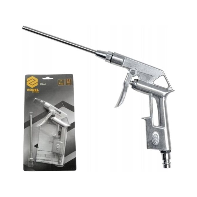 Пистолет для продувки VOREL с удлинителем 81644 используется для очистки поверхностей и труднодоступных мест от грязи и пыли.